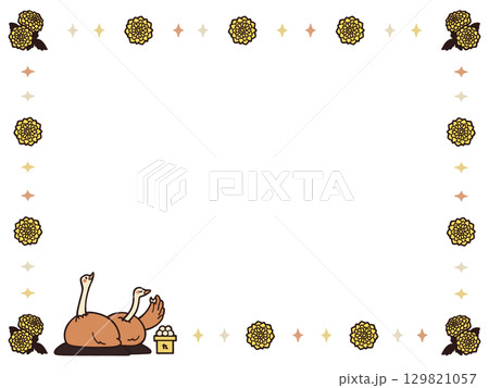 ダリアを月に見立ててお月見しているダチョウのフレームイラスト