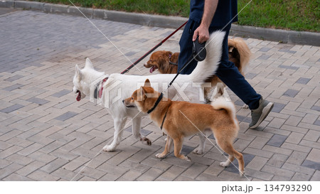 dog walker, dog handler on a walk with their pets. owner of the pet walks through meadow of park