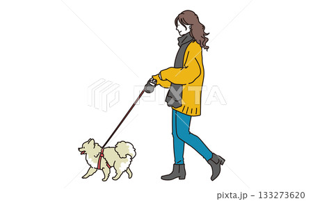 イチョウ並木を犬用カートで散歩するポメラニアン 秋素材