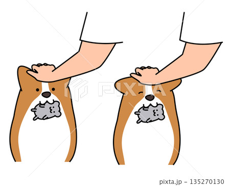 おもちゃをくわえて飼い主に頭を撫でられ喜ぶコーギーのイラスト
