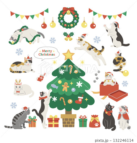 クリスマスに遊ぶかわいい白猫のイラスト 主線あり