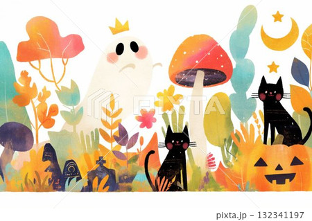 黒猫・かぼちゃ・おばけの水彩風ハロウィンフレームイラスト