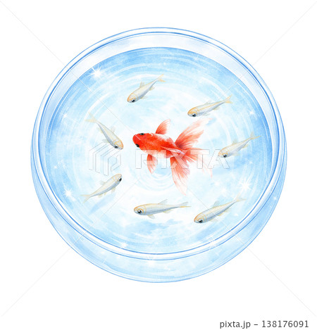 金魚と小魚を上から見たシンプル素材 夏の涼しげアクアリウムイメージ 白背景