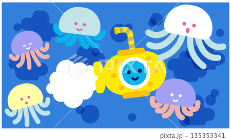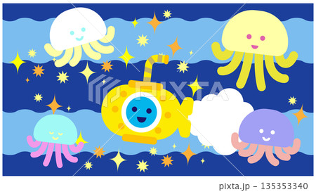 クラゲに囲まれた潜水艦のかわいい海のファンタジーイラスト