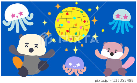 夜の海でラッコとクラゲが集まるかわいいファンタジーイラスト