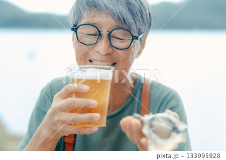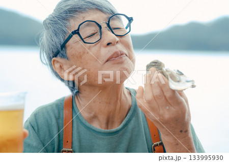 シニア女性が海辺でビールと牡蠣を楽しむシーン