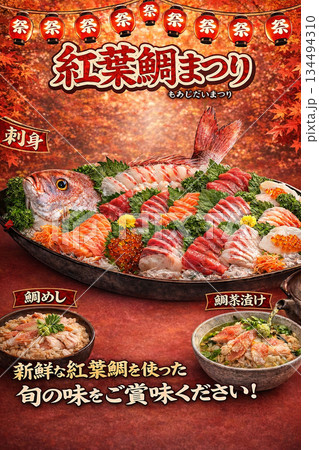 お祝いのタグと飾り紐が付けられた新鮮な赤い鯛のリアルな手描き風イラスト