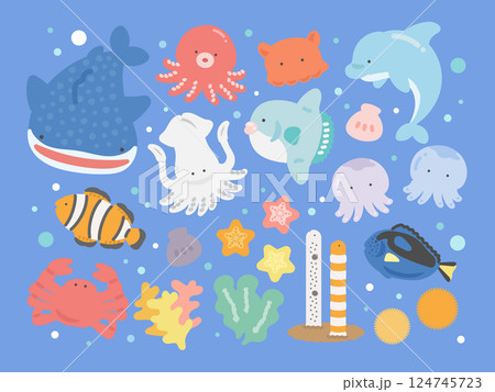 海の生物のアイコン(線画カラー)(背景あり)のイラストセット