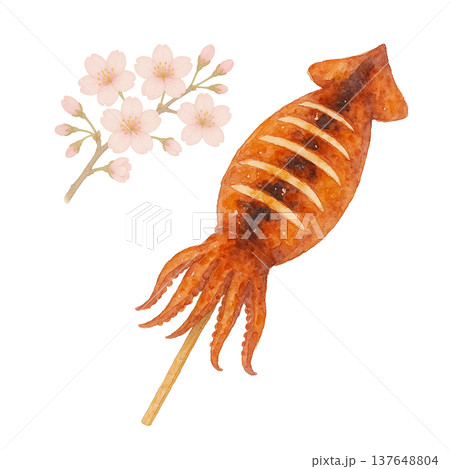 桜の花とイカの水彩イラスト 海鮮食材素材