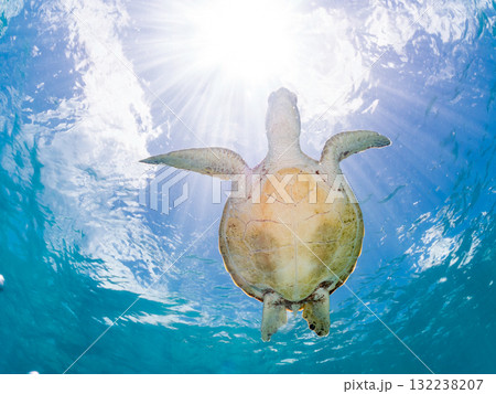 息継ぎをするために浮上するアオウミガメ。美しいサンゴ礁と熱帯魚の群れ。島尻郡慶良間諸島座間味島安室島