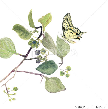 水彩で描いた蝶が花の蜜を吸っているイラスト素材【手描き】白バック コピースペース 透過背景
