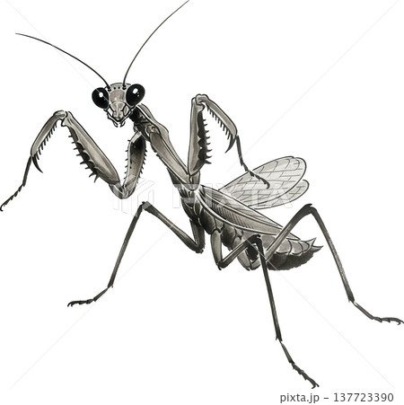 睨みつけるカマキリのリアルな水墨画風イラスト