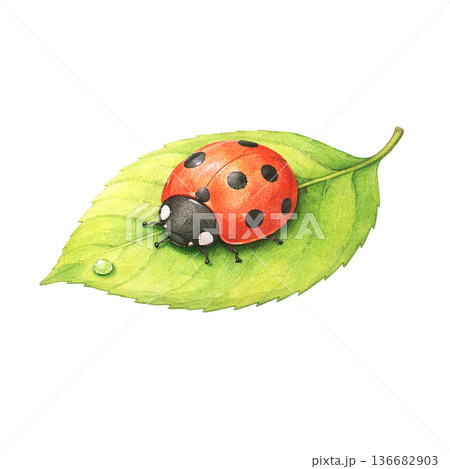 鮮やかな赤いてんとう虫と緑の葉のリアルなイラスト