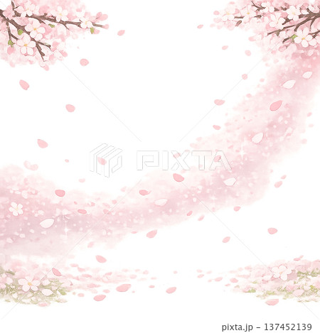 花びらが舞い散る淡い色合いの桜並木のイラスト(横長)