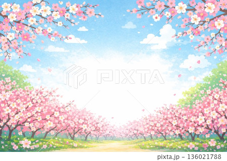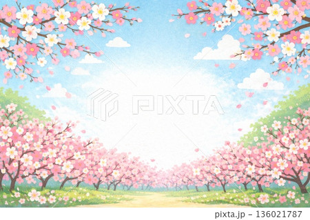 やさしい色合いの桜並木フレーム 背景イラスト
