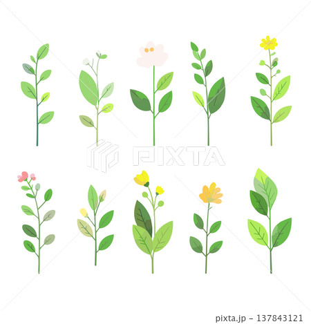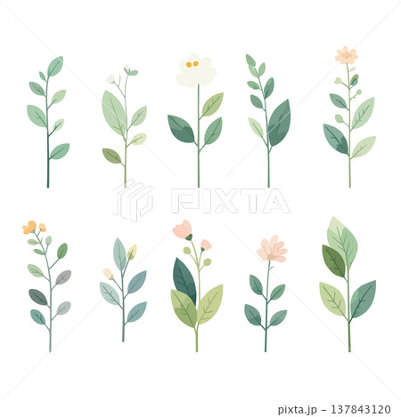 手描き風の花と葉のカラフルなボタニカルイラストセット