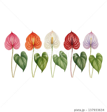 アンスリウムの水彩イラストセット カラーバリエーション 熱帯植物のボタニカル素材(5色)