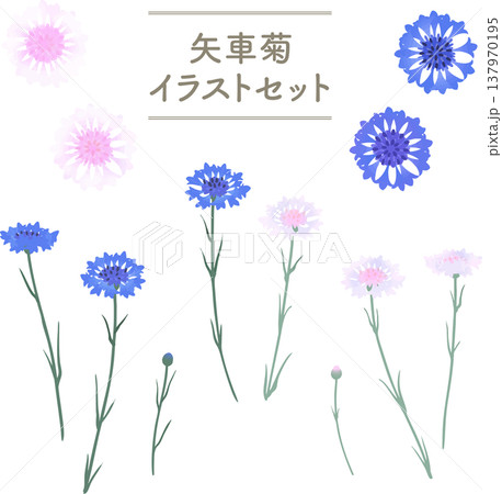 矢車菊のイラストセット(青・白ピンク)|春夏のフラットベクター素材