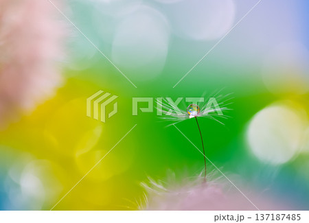 柔らかな光の中で露に濡れたタンポポの種のクローズアップ