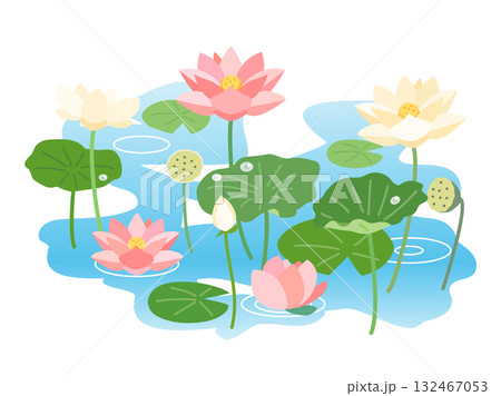 蓮と睡蓮が咲き誇る池をイメージしたイラスト