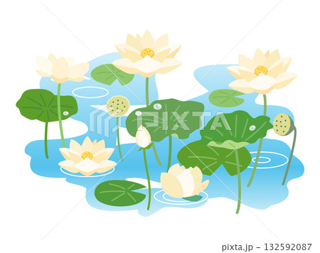 白い蓮と睡蓮が咲き誇る池をイメージしたイラスト