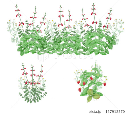 ハーブティー用素材のセットイラスト ワイルドストロベリー・レモン・ミント