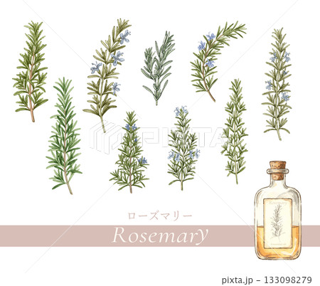 カモミール、クラリセージ、ネロリ、ジュニパー、ローズ、イランイラン精油のイラスト