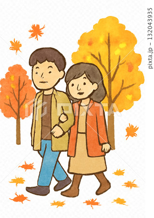 秋の紅葉を歩くカップルのイラスト(AI生成・透過背景・シード値0)