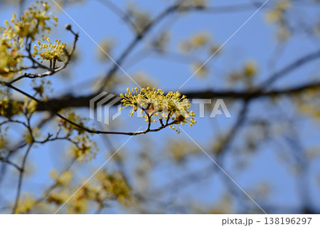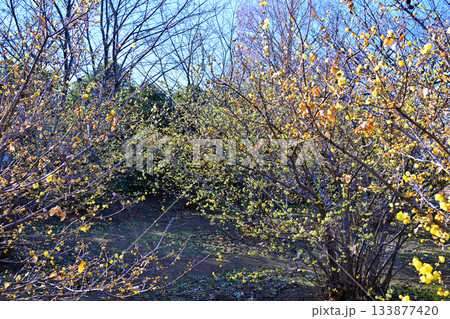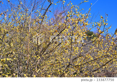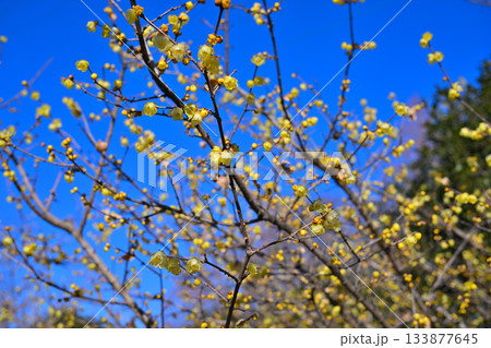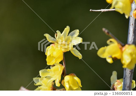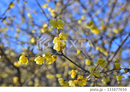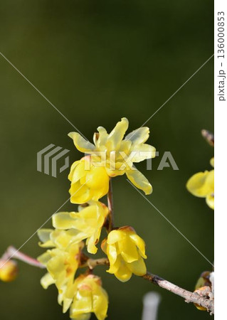 冬の庭に咲くロウバイの黄色い花と自然のボケ味