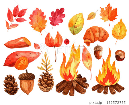 紅葉、焚き火、ドングリなど秋のイラストセット
