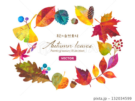 秋の紅葉した、自然素材のイラストセット。紅葉やどんぐりなどの木の実。カラフルなペインティングテクスチ