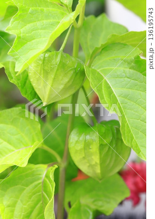 お盆に仏花として供える赤いホオズキの実緑の背景で