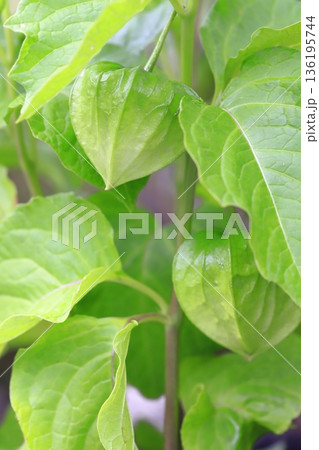 雨に打たれて土が付着したホオズキの実(夏、七月)