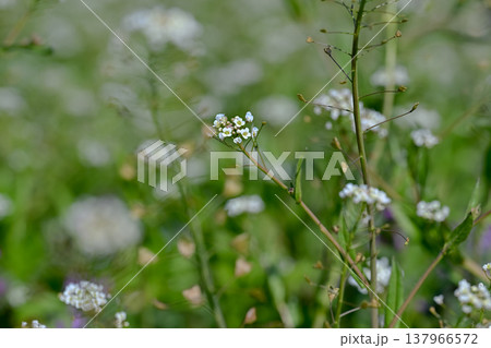 黄色の花たちの中に咲く白い花の背景素材 バックグラウンド シロツメクサ コメツブツメクサ 夕日カラー
