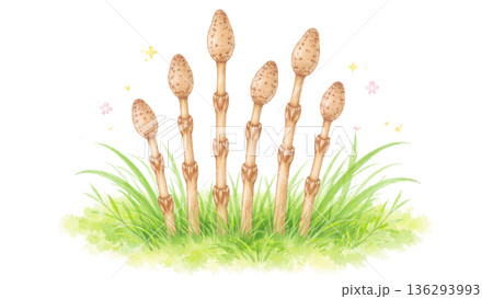早春の植物、にょきにょきと生え始めた土筆の水彩画イラスト