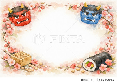 水彩風の節分イラスト(赤鬼・青鬼・恵方巻き・豆と梅の背景)
