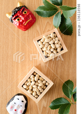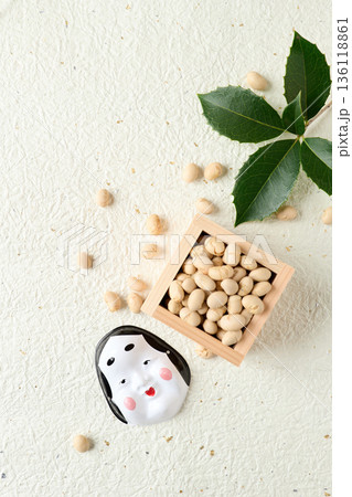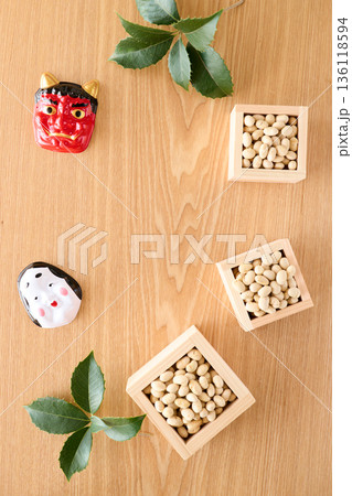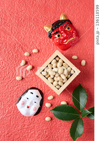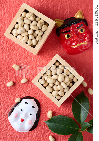 た福豆入りの枡と赤鬼のお面 節分イメージ素材