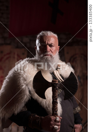 A resolute Viking chieftain, with a white beard and fur cloak, stands holding a formidable axe over his shoulder and a red and black round shield, embodying strength and ancient resolve.
