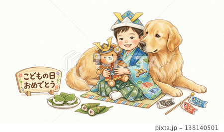 こどもの日おめでとう 端午の節句を祝う男の子と犬のイラスト