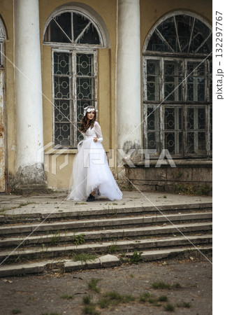Caucasian young woman bride spinning whirls dancing posing moving at nature