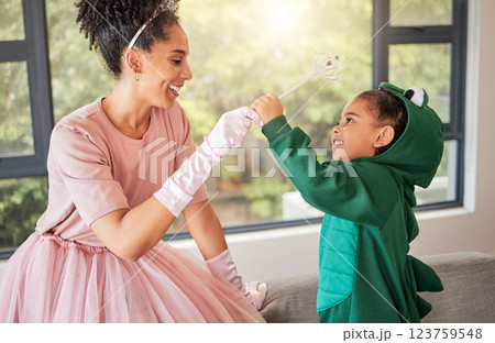 Child halloween party, mother as princess and girl in dinosaur suit for for creative kid development in home together with lens flare. Happy mom with kid birthday in a fantasy or fairy character