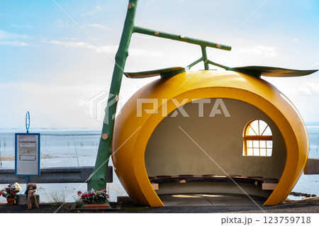 有明湾を望むフルーツバス停 フルーツバス停のアイデアの元になったのは、グリム童話「シンデレラ」に登場