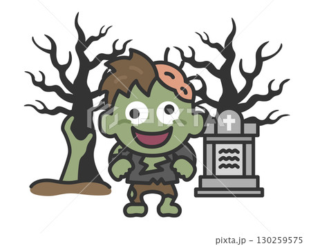 墓地にいる、ゾンビのキャラクター(線画カラー)のイラスト
