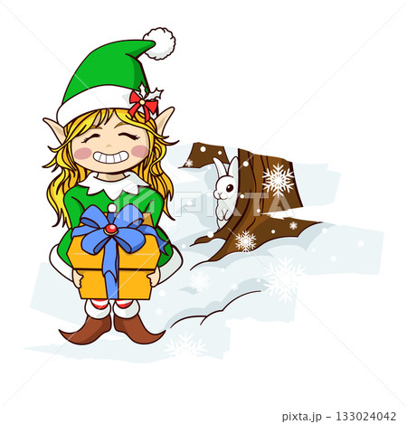 笑顔のエルフと白うさぎのクリスマスイラスト|プレゼントを持つ妖精と冬の森の風景