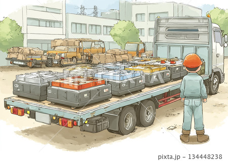 大型バッテリーモジュールをトラックで輸送する産業物流のイメージ