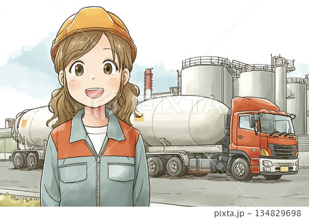 液体水素タンク車両を管理する若い女性作業員の現場イラスト