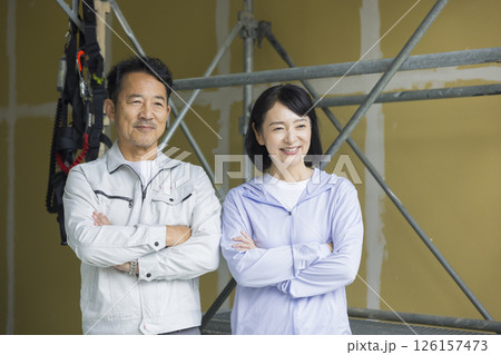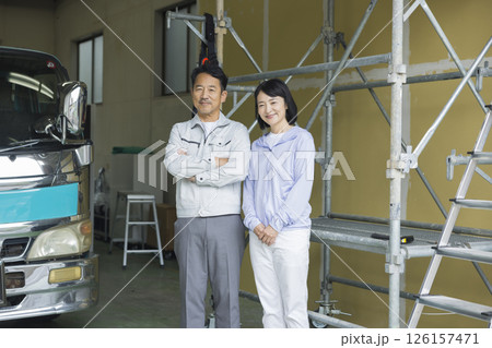 トラックの模型を持つグレーのスーツ姿のミドル女性