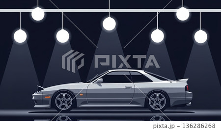 スポットライトに輝く研ぎ澄まされたスポーツカー