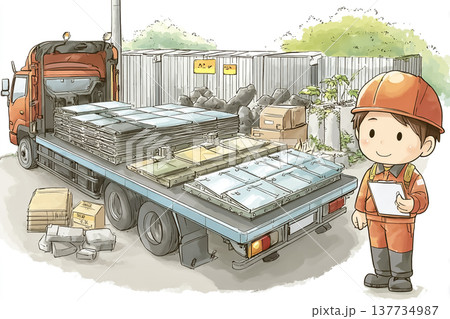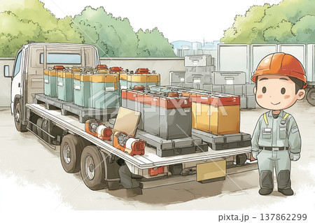 大型蓄電池を輸送する男性作業員|トラックとエネルギー物流の仕事イメージ