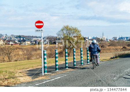 歩行者専用通路への自転車進入禁止を告知する看板とバリケード